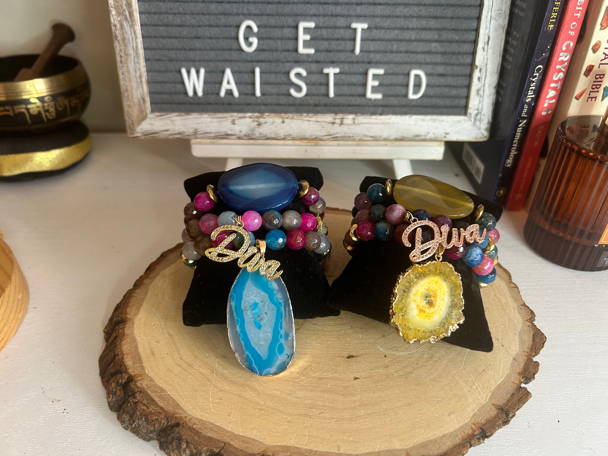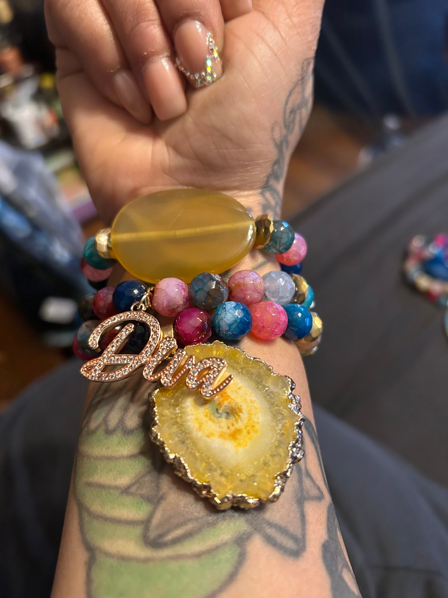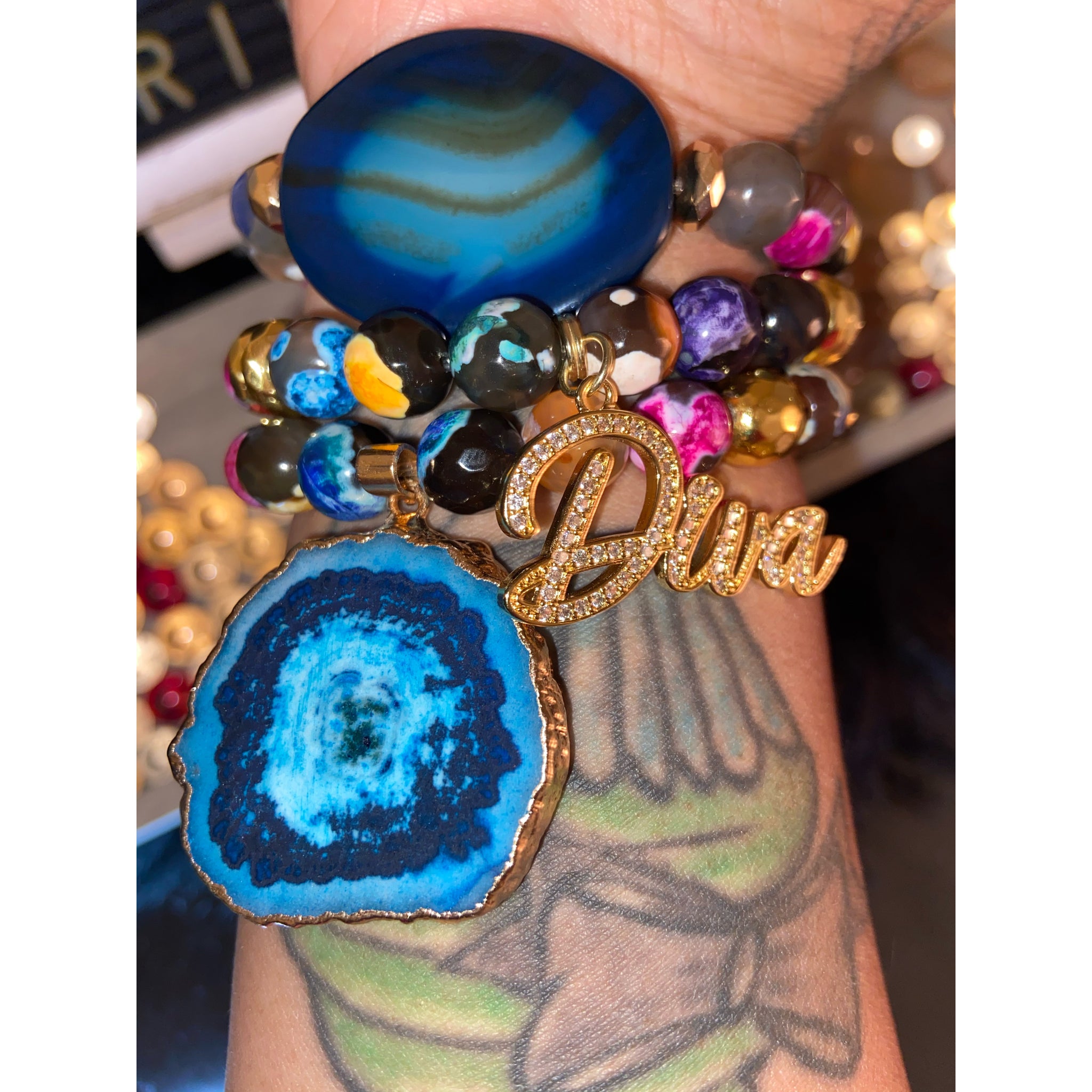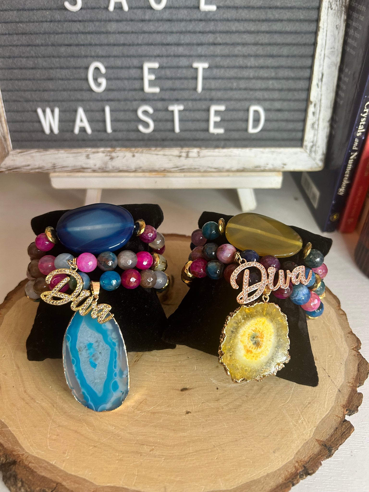 Every bracelet is accented with a sparkling “Diva” charm and finished with a stunning large agate stone pendant that brings the entire look together.
