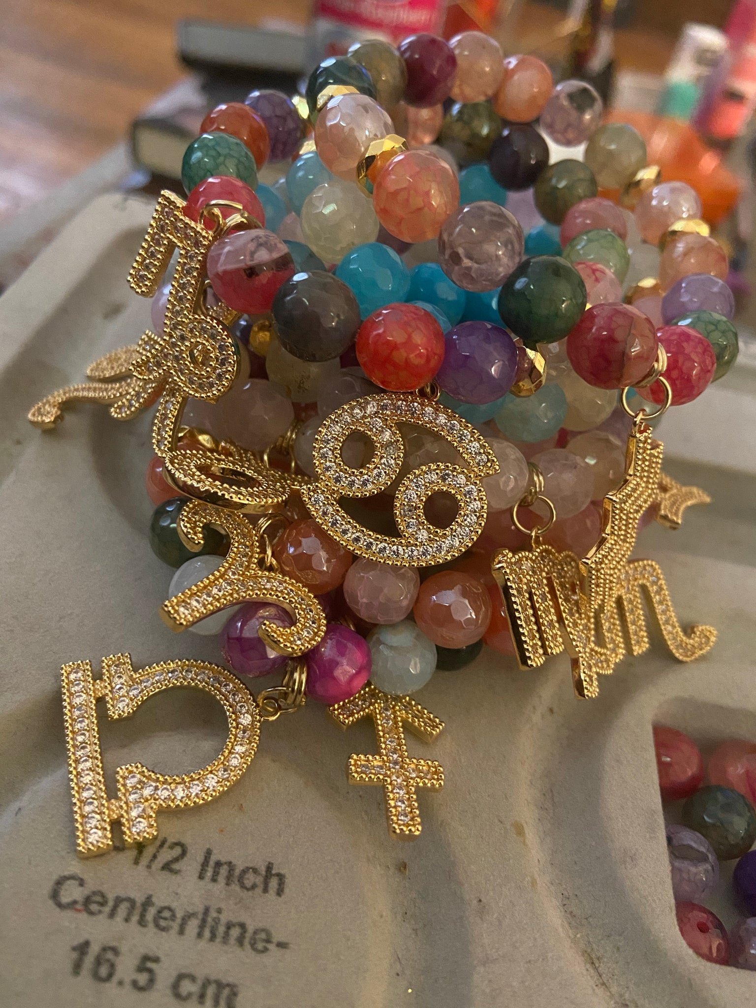 Pastel colored zodiac bracelets comprised of 10mm faceted striated agate stones & accented with gold hematite spacers & gold zodiac charms
