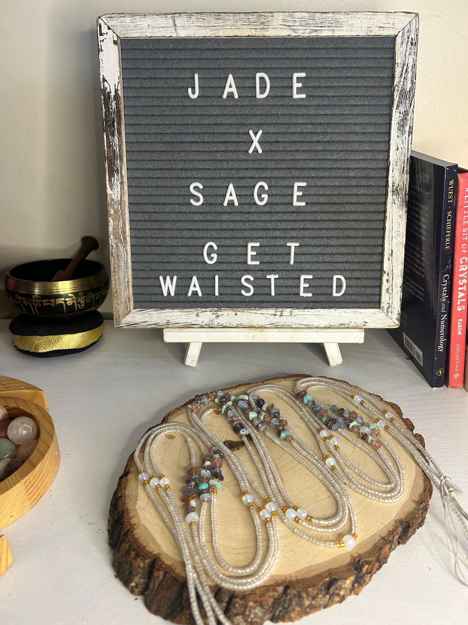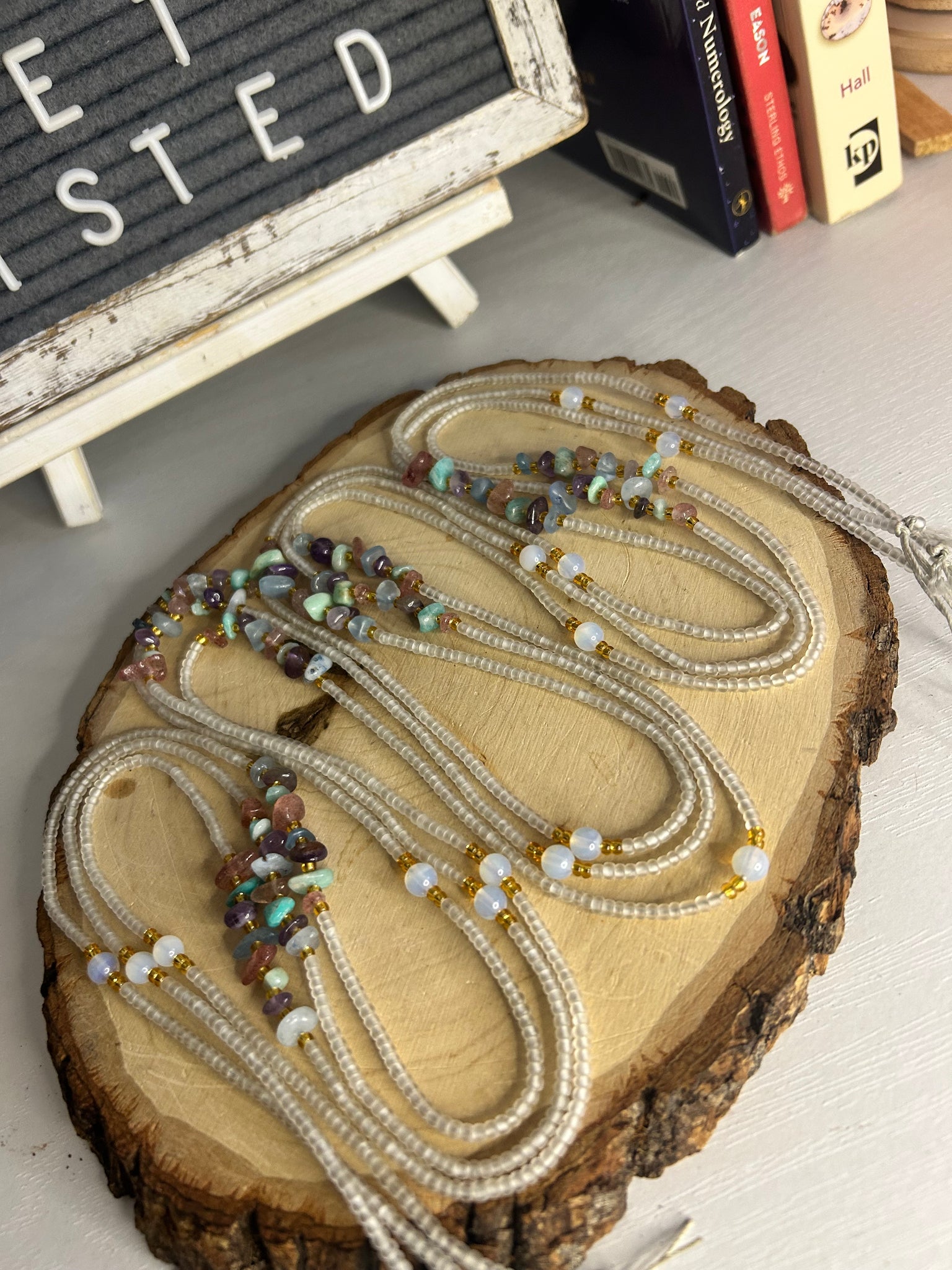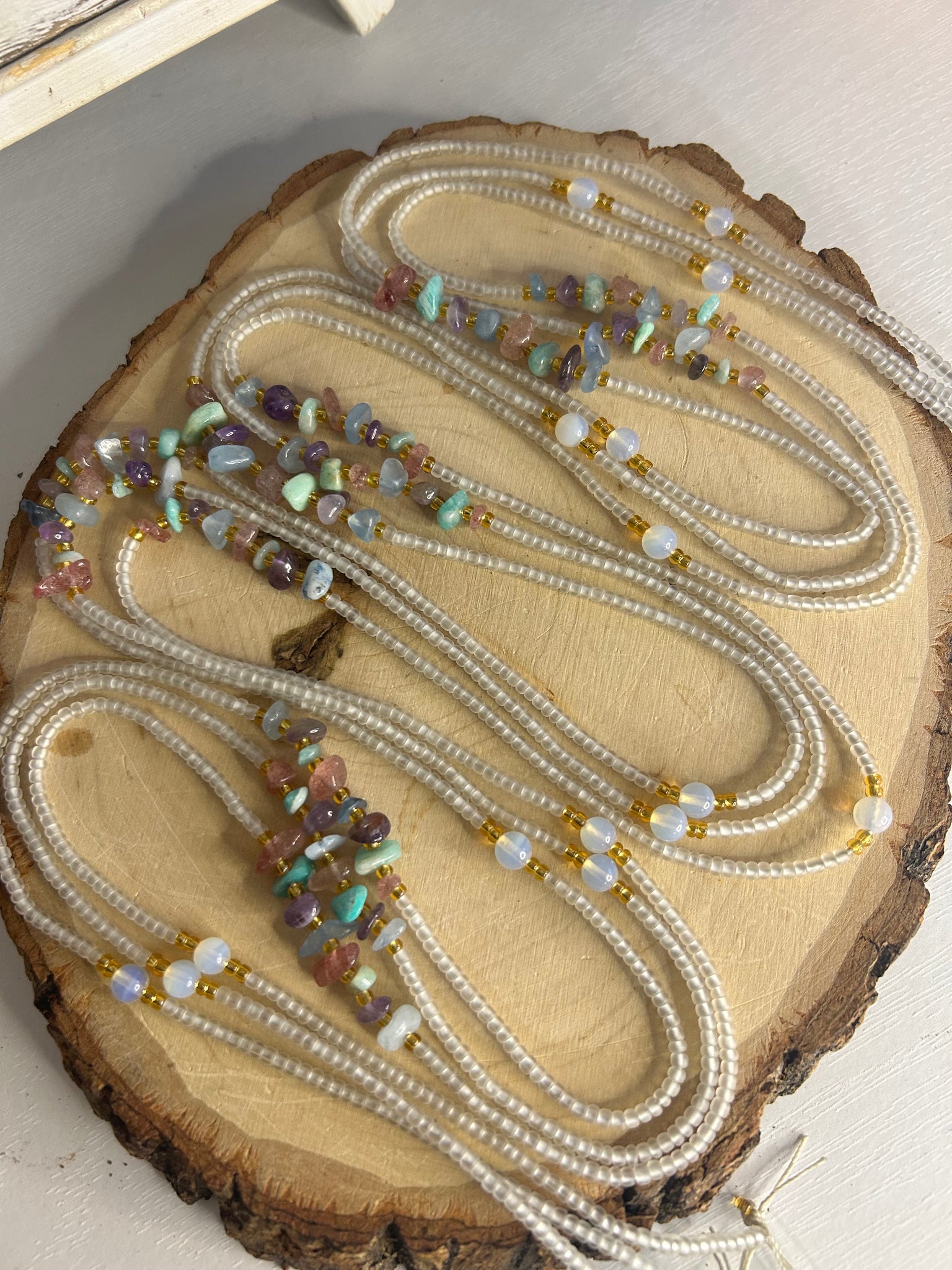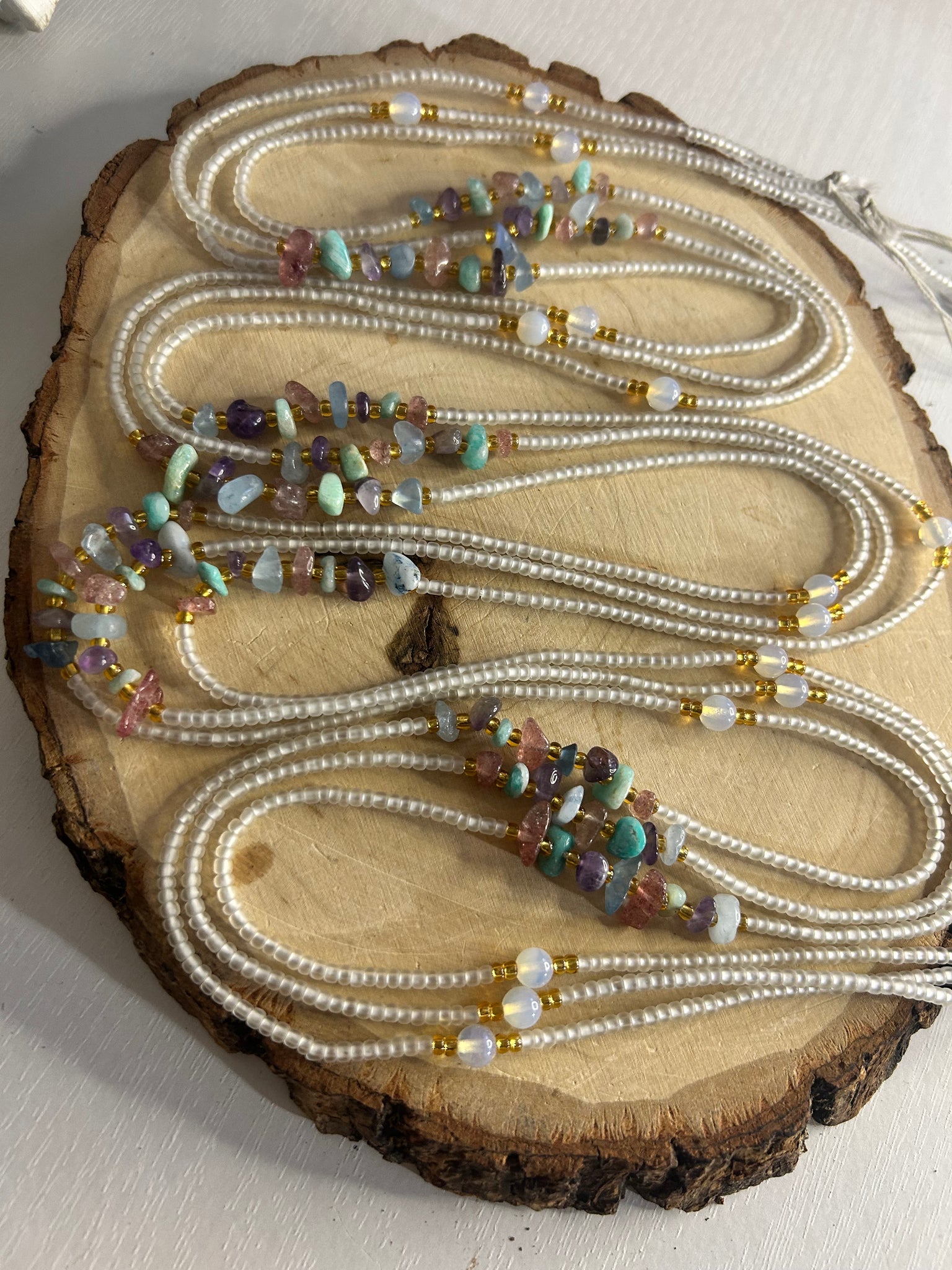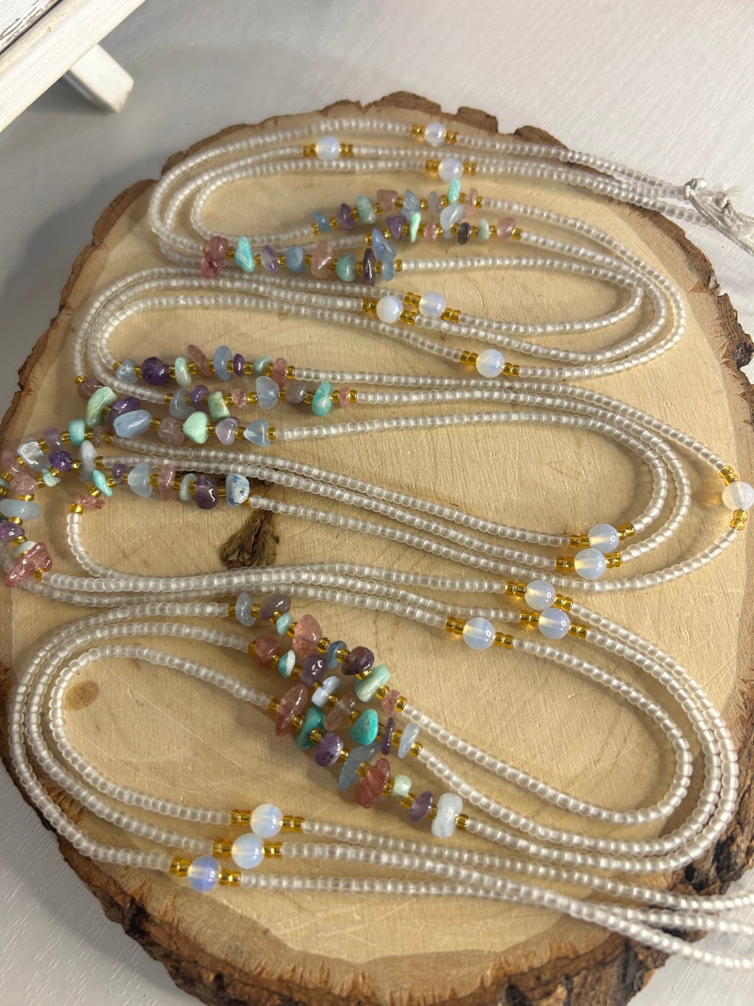 The frosted white beads amplify the gentle energies of these crystals while symbolizing clarity, purity, and spiritual alignment, making this waistbead perfect for meditation, manifestation, or daily wear.