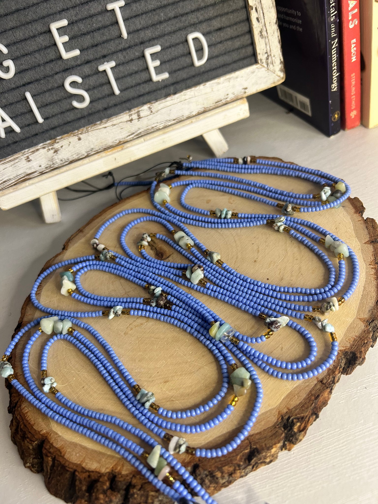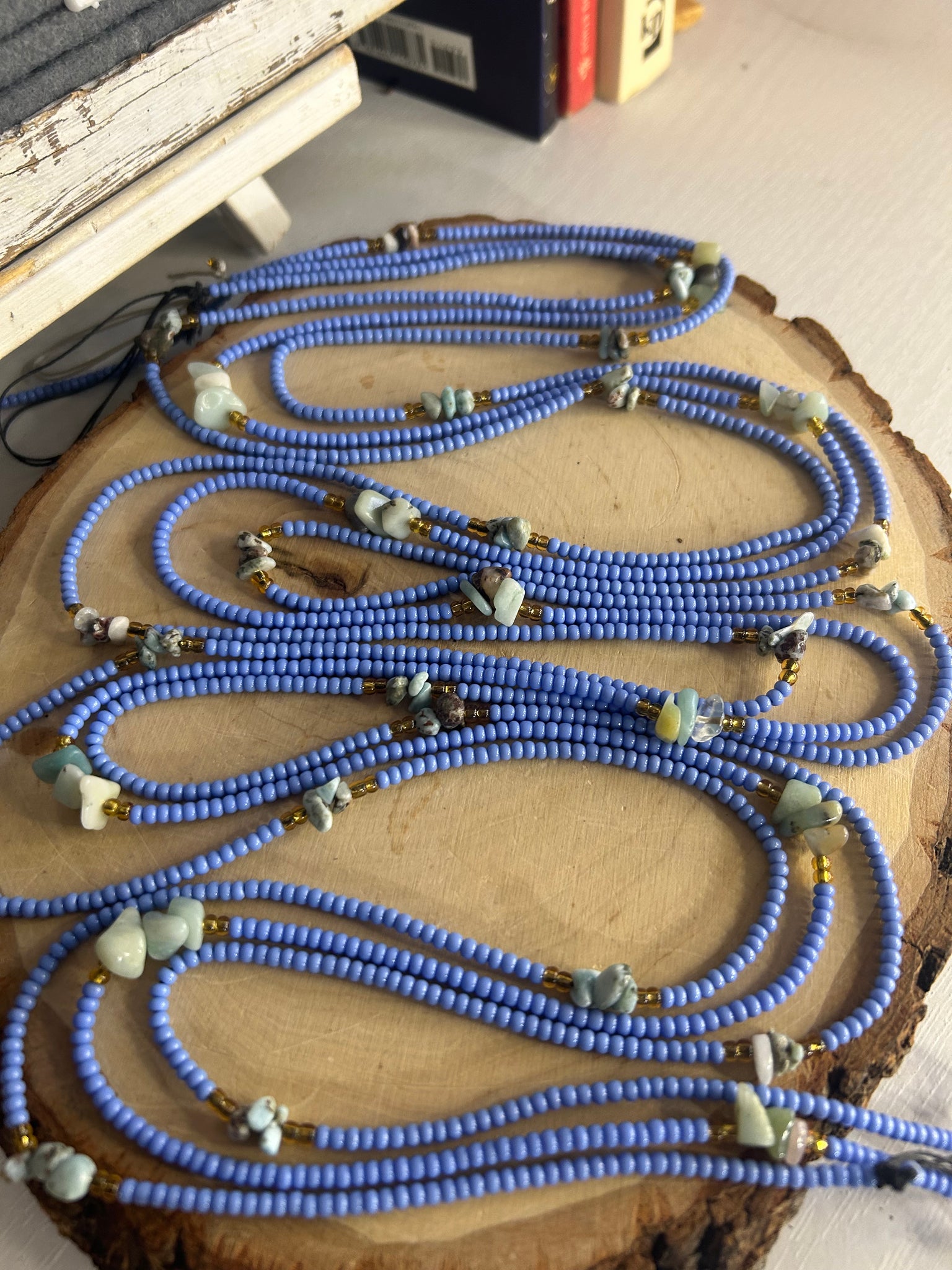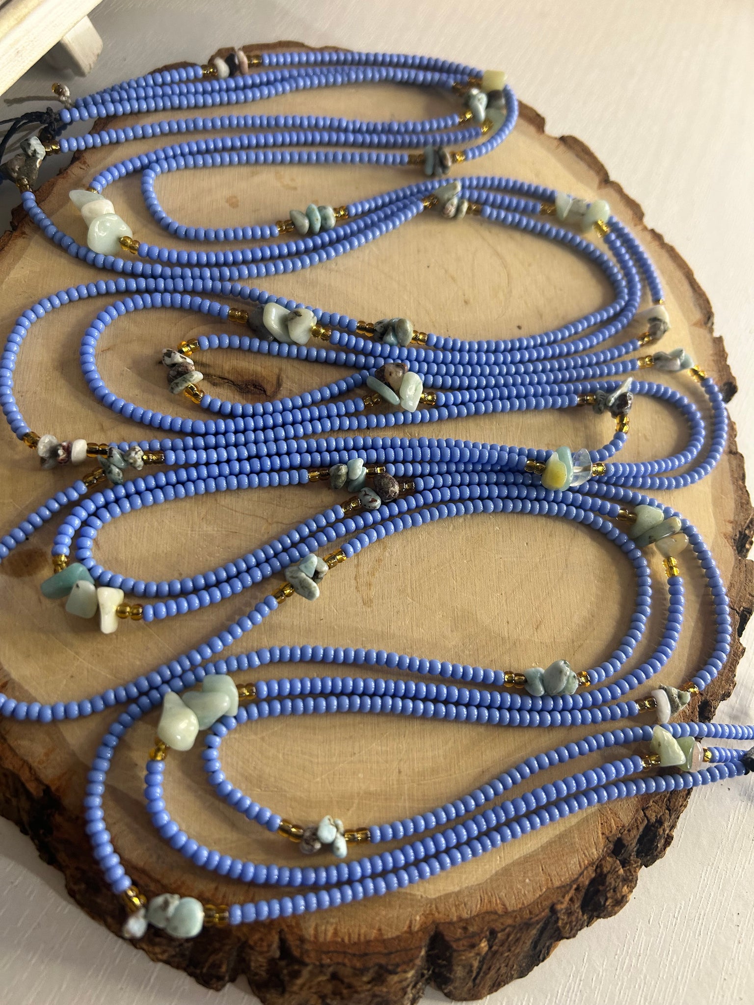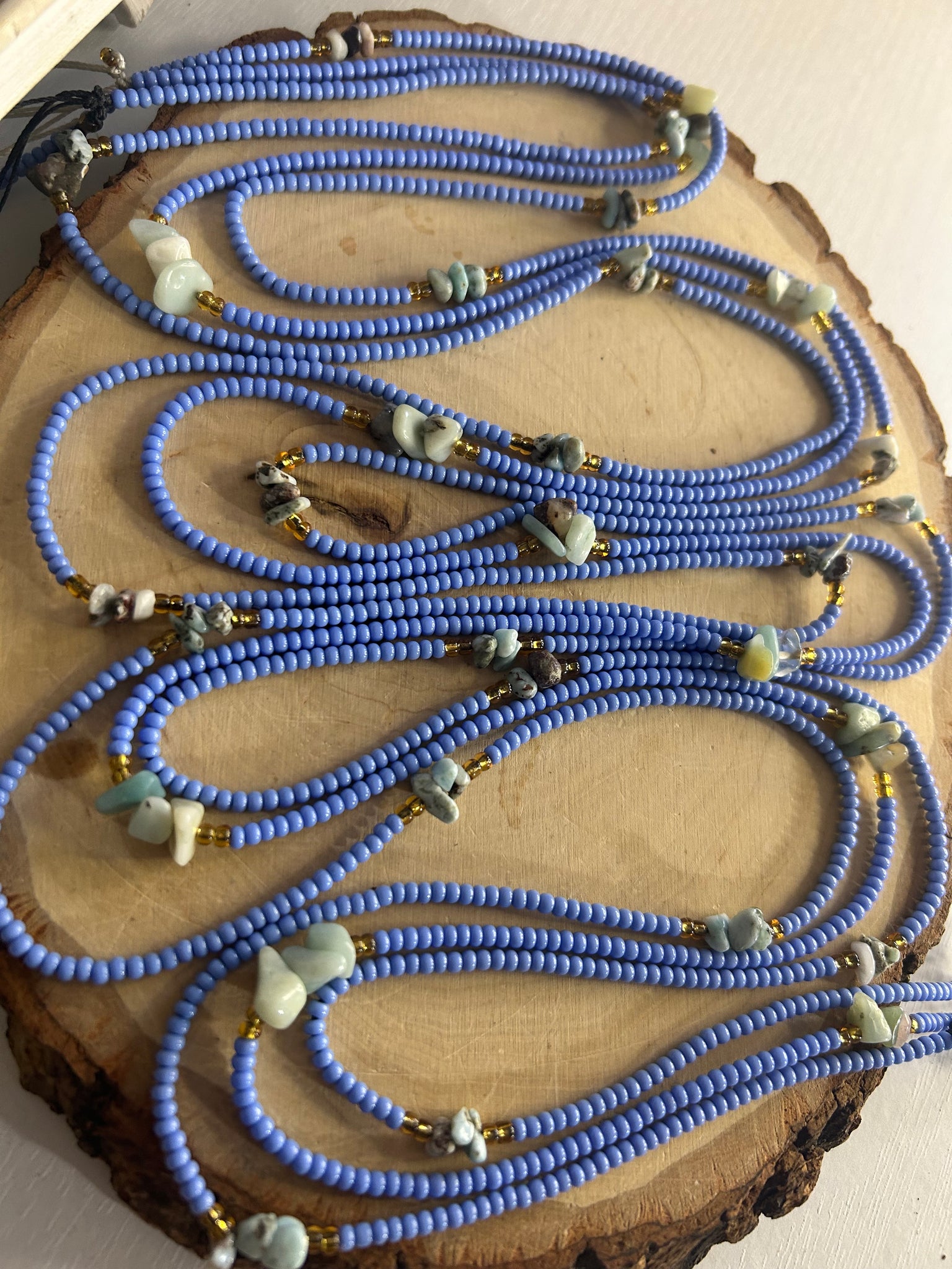The periwinkle blue beads enhance Larimar’s serene vibrations while symbolizing clarity, peace, and spiritual alignment, making this waistbead perfect for meditation, manifestation rituals, or mindful daily wear.