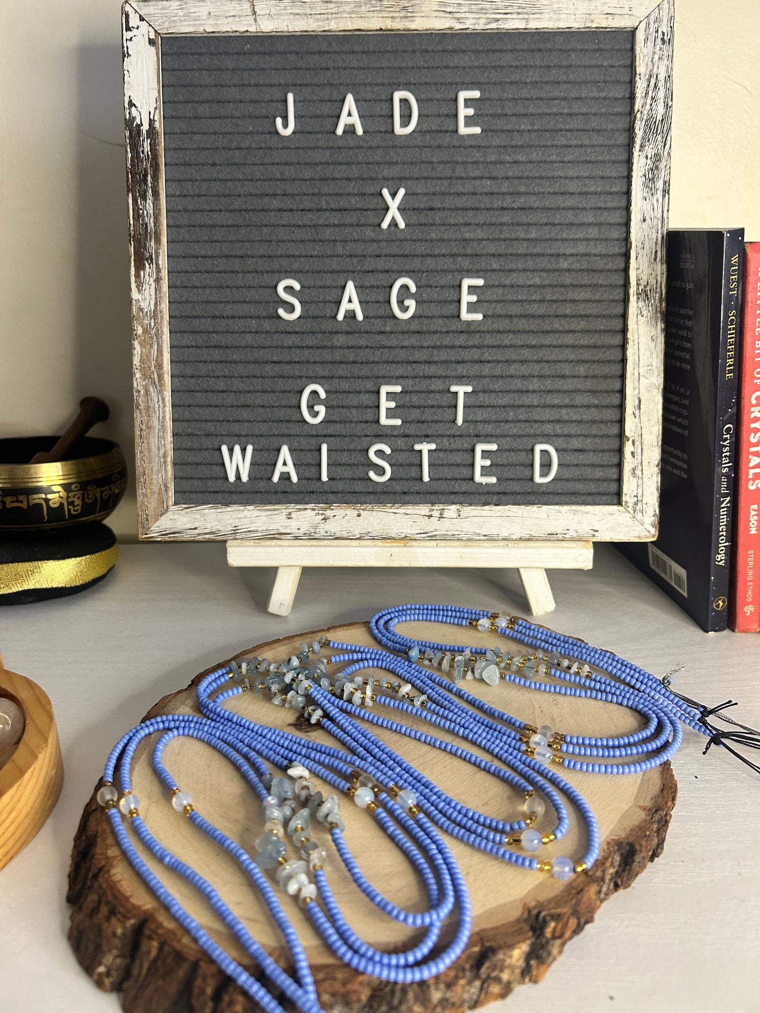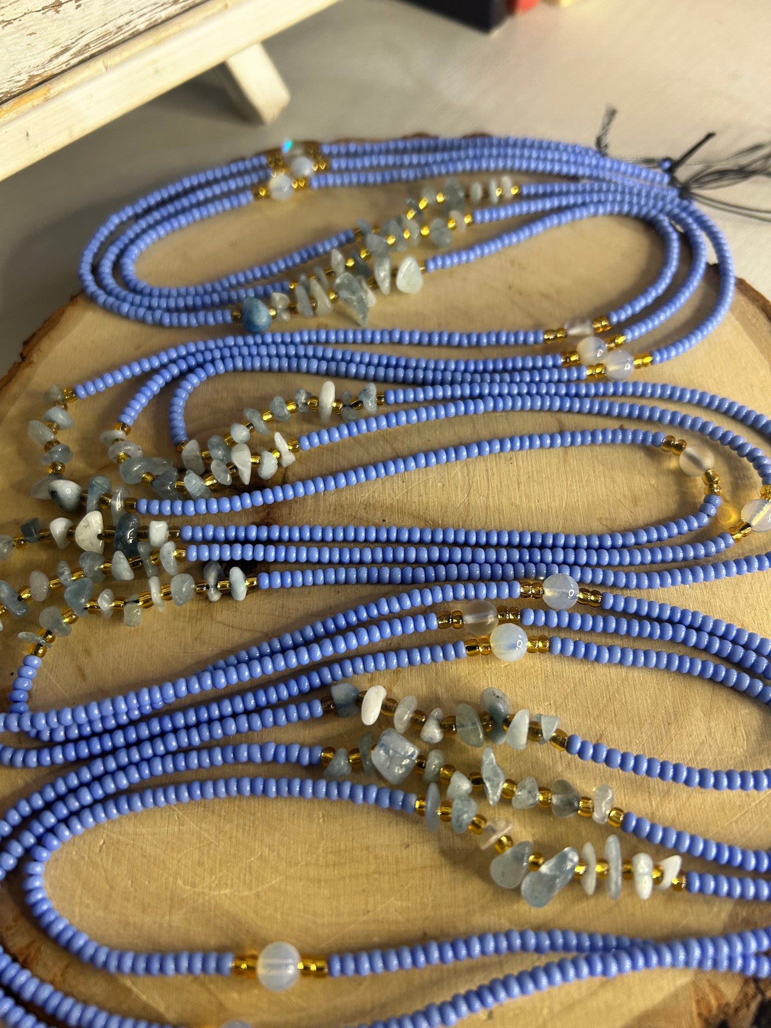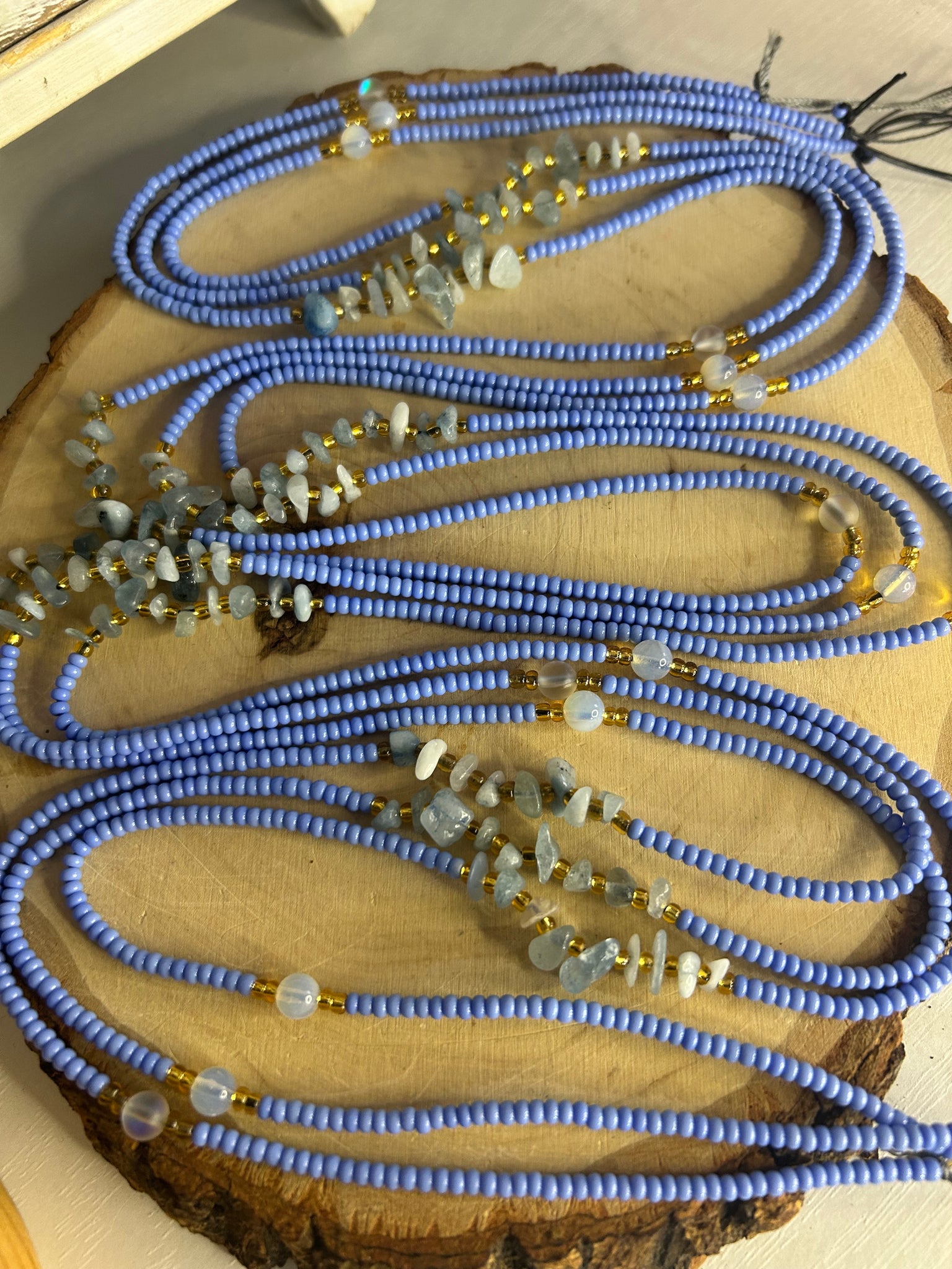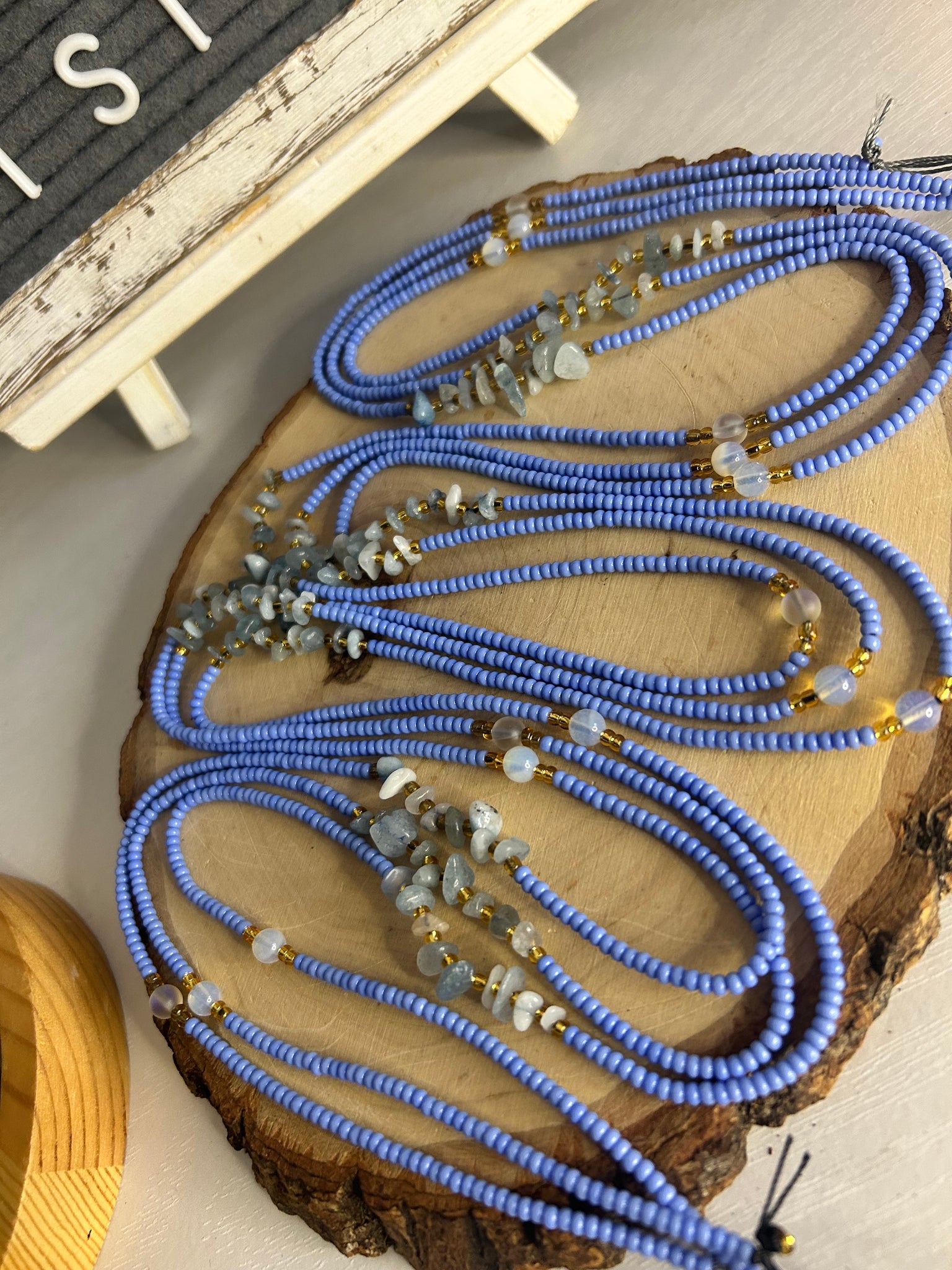 Step into calm confidence with our Proper Peace Waistbead, handcrafted with soothing periwinkle blue beads and genuine Aquamarine crystals. This strand is designed for the woman who wants to cultivate inner peace, clarity, and emotional balance while radiating serene energy.