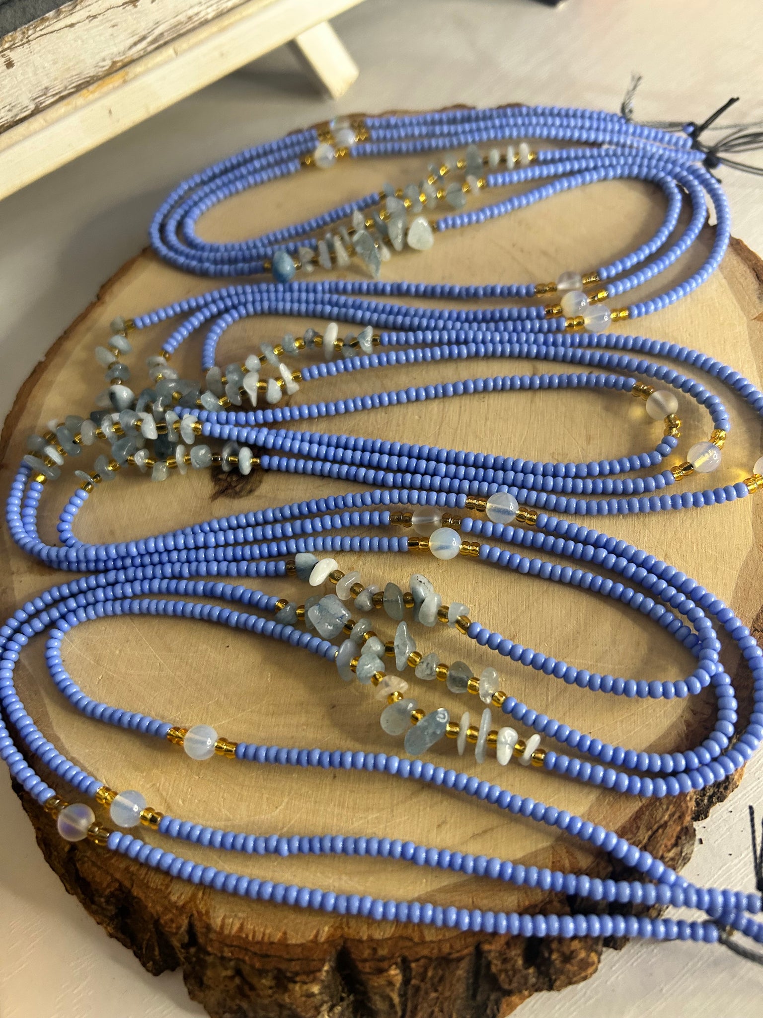 The periwinkle blue beads enhance Aquamarine’s soothing properties while symbolizing clarity, serenity, and spiritual alignment. This waistbead is perfect for daily wear, meditation, manifestation rituals, or as a mindful reminder to move through life with grace.